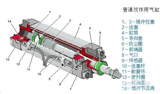 以气动系统中常使用的单活塞杆双作用气缸为例来说明,气缸典型结构如下图所示。它由缸筒、活塞、活塞杆、前端盖、后端盖及密封件等组成。双作用气缸内部被活塞分成两个腔。有活塞杆腔称为有杆腔,无活塞杆腔称为无杆腔。