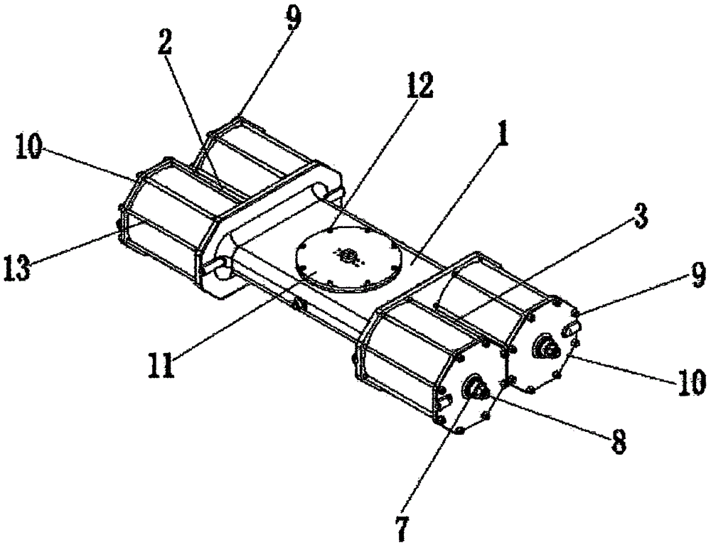 本实用新型工作原理:使用时,通过设置的主齿轮14开始转动,通过设置在其上的若干组锯齿以及第一活塞杆4和第二活塞杆16上的凹槽组合运动,并使设置的第一活塞杆4和第二活塞杆16反向运动,从而带动活塞组件5在第一气缸组2和第二气缸组3内部进行往返运动,调节内部气压为整体装置提高原动力,且通过设置的上盖11和上盖螺钉12便于用户对执行器主体1进行安装和拆卸,并对其内部进行检修和零部件的更换,同时通过设置的拉杆13和拉杆螺母9便于将端盖10和第一气缸组2、第二气缸组3进行固定安装,从而大大增加了其稳固性,于此同时,通过设置的调节螺母7和调节螺栓8具有调节精度高的优点,整体装置结构简单,性能更稳定、调节精度高以及输出扭矩平稳,具有一定的推广价值。